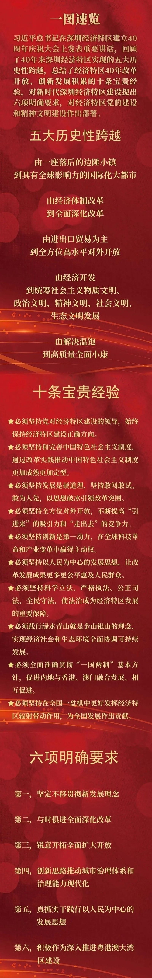 深圳经济特区建立40周年庆祝大会14日上午在广东省深圳市隆重举行。中共中央总书记、国家主席、中央军委主席习近平在会上发表重要讲话强调,要高举中国特色社会主义伟大旗帜,统筹推进“五位一体”总体布局,协调推进“四个全面”战略布局,从我国进入新发展阶段大局出发,落实新发展理念,紧扣推动高质量发展、构建新发展格局,以一往无前的奋斗姿态、风雨无阻的精神状态,改革不停顿,开放不止步,在更高起点上推进改革开放,推动经济特区工作开创新局面,为全面建设社会主义现代化国家、实现第二个百年奋斗目标作出新的更大的贡献。 中共中央政治局常委、国务院副总理韩正出席大会。 深圳前海国际会议中心灯光璀璨、气氛热烈。会场高悬横幅:坚持以习近平新时代中国特色社会主义思想为指导,不忘初心、牢记使命,朝着建设中国特色社会主义先行示范区的方向前行,在开启全面建设社会主义现代化国家新征程中作出新的更大的贡献! 10时30分,大会开始。全体起立,高唱国歌。 在热烈的掌声中,习近平发表重要讲话。他强调,兴办经济特区,是党和国家为推进改革开放和社会主义现代化建设进行的伟大创举。长期以来,在党中央坚强领导和全国大力支持下,各经济特区解放思想、改革创新,勇担使命、砥砺奋进,在建设中国特色社会主义伟大进程中谱写了勇立潮头、开拓进取的壮丽篇章,为全国改革开放和社会主义现代化建设作出了重大贡献。 习近平代表党中央、国务院和中央军委,向经济特区广大建设者,向所有为经济特区建设作出贡献的同志们,致以诚挚的问候!向各位来宾,向关心和支持经济特区建设的国内外各界人士,表示衷心的感谢! 习近平指出,深圳是改革开放后党和人民一手缔造的崭新城市,是中国特色社会主义在一张白纸上的精彩演绎。40年来,深圳奋力解放和发展社会生产力,大力推进科技创新,实现了由一座落后的边陲小镇到具有全球影响力的国际化大都市的历史性跨越;坚持解放思想、与时俱进,率先进行市场取向的经济体制改革,实现了由经济体制改革到全面深化改革的历史性跨越;坚持实行“引进来”和“走出去”,积极利用国际国内两个市场、两种资源,积极吸引全球投资,实现了由进出口贸易为主到全方位高水平对外开放的历史性跨越;坚持发展社会主义民主政治,尊重人民主体地位,加强社会主义精神文明建设,积极培育和践行社会主义核心价值观,实现了由经济开发到统筹社会主义物质文明、政治文明、精神文明、社会文明、生态文明发展的历史性跨越;坚持以人民为中心,人民生活水平大幅提高,教育、医疗、住房等实现翻天覆地的变化,率先完成全面建成小康社会的目标,实现了由解决温饱到高质量全面小康的历史性跨越。深圳等经济特区的成功实践充分证明,党中央关于兴办经济特区的战略决策是完全正确的。经济特区不仅要继续办下去,而且要办得更好、办得水平更高。 习近平强调,深圳等经济特区40年改革开放实践积累了宝贵经验,深化了我们对中国特色社会主义经济特区建设规律的认识。一是必须坚持党对经济特区建设的领导,始终保持经济特区建设正确方向。二是必须坚持和完善中国特色社会主义制度,通过改革实践推动中国特色社会主义制度更加成熟更加定型。三是必须坚持发展是硬道理,坚持敢闯敢试、敢为人先,以思想破冰引领改革突围。四是必须坚持全方位对外开放,不断提高“引进来”的吸引力和“走出去”的竞争力。五是必须坚持创新是第一动力,在全球科技革命和产业变革中赢得主动权。六是必须坚持以人民为中心的发展思想,让改革发展成果更多更公平惠及人民群众。七是必须坚持科学立法、严格执法、公正司法、全民守法,使法治成为经济特区发展的重要保障。八是必须践行绿水青山就是金山银山的理念,实现经济社会和生态环境全面协调可持续发展。九是必须全面准确贯彻“一国两制”基本方针,促进内地与香港、澳门融合发展、相互促进。十是必须坚持在全国一盘棋中更好发挥经济特区辐射带动作用,为全国发展作出贡献。 习近平指出,当今世界正经历百年未有之大变局,我国正处于实现中华民族伟大复兴的关键时期,经济已由高速增长阶段转向高质量发展阶段。深圳要建设好中国特色社会主义先行示范区,创建社会主义现代化强国的城市范例,提高贯彻落实新发展理念能力和水平,形成全面深化改革、全面扩大开放新格局,推进粤港澳大湾区建设,丰富“一国两制”事业发展新实践,率先实现社会主义现代化。第一,坚定不移贯彻新发展理念。要坚持供给侧结构性改革这条主线,坚定不移实施创新驱动发展战略,加大基础研究和应用基础研究投入力度,培育新动能,提升新势能。要大力发展现代服务业,提升服务业发展能级和竞争力。要实施更加开放的人才政策,聚天下英才而用之。第二,与时俱进全面深化改革。党中央经过深入研究,支持深圳实施综合改革试点,以清单批量授权方式赋予深圳在重要领域和关键环节改革上更多自主权。深圳经济特区要扛起责任,牢牢把握正确方向,努力在重要领域推出一批重大改革措施。第三,锐意开拓全面扩大开放。要优化升级生产、分配、流通、消费体系,增强畅通国内大循环和联通国内国际双循环的功能,加快推进规则标准等制度型开放,率