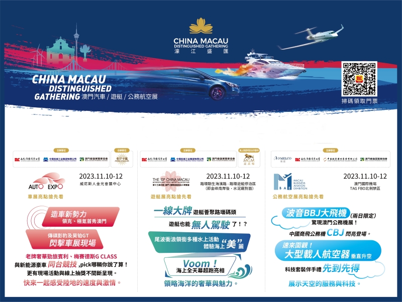 由南光(集团)有限公司、澳门会议展览业协会、中国机械工业集团有限公司、中国航空器材集团有限公司联合主办的2023年濠江盛汇“第十三届中国(澳门)国际汽车博览会”“第十二届澳门公务航空展”“第十三届中国(澳门)国际游艇博览会”将于11月9日-12日盛大举办,继续为澳门打造“陆海空”联展盛事,推动澳门成为国际旅游休闲都市和“盛会之都”。 澳门车展 迎接智慧出行新时代 第十三届澳门车展于11月10日-12日在威尼斯人金光会展中心举行。本次车展展示面积约6.5万平方米,参展企业数量达75家,参展品牌100余个,展车数量超400辆。领克、极氪首秀澳门,腾势D9乘势而动,多款重磅国产新能源车亮相。同有澳门大赛车同款领克03+cyan版、宾利、奔驰G CLASS等进口豪车亮点车型与观众“会面”,更有“网红”传祺影豹及埃安GT上演速度传说。新能源客车、商用车、电单车,汇聚一堂,精彩纷呈的现场活动,都将为澳门市民带来一年一度的汽车盛宴。 澳门游艇展 展现世界顶级游艇新风采 第十三届澳门游艇展于11月9日-12日于澳门路环游艇码头举行。游艇展展览规模达5.5万平方米,共计来自20多个国家和地区的40余艘船艇将集中亮相展会。作为澳门海洋招商的新引擎,本次展区游艇品牌参展多、亮点足,众多国际一线品牌船型及国内最新智能科技无人驾驶游艇齐聚澳门路环码头,充分展现游艇产业国际化、专业化的发展趋势,一睹世界顶级游艇的风采及感知最新游艇前沿科技,领略海洋的奢华与魅力,感受水上嘉年华。 澳门公务航空展—展示公务机服务与科技新成果 第十二届澳门公务航空展将于11月10日-12日在澳门国际机场举行。本次航展面积达1.5万平方米,展出飞机数量较去年同比增长一倍。期间,波音BBJ2远程大型公务机于专业日期间亮相澳门、中国商飞携CBJ登场,多家企业参展。展期有供青少年参与的“Future Day”航空航天知识科普及模型拼装活动,以及联合金融时报共同举办“商务航空金融与高端定制商旅出行(澳门)论坛”活动,向澳门市民展示来自公务机的服务与科技的力量。 2023“濠江盛汇”系列展会秉持“南光+”合作发展理念,携手各企业联合主办的汽车、游艇、公务航空展已经成为澳门高端会展界重要名片。本次展会结合澳门特色优势,拓展合作空间,发挥“旅游+会展”优势,变中求新推广澳门多元形象,为推动澳门经济适度多元发展贡献力量。 |