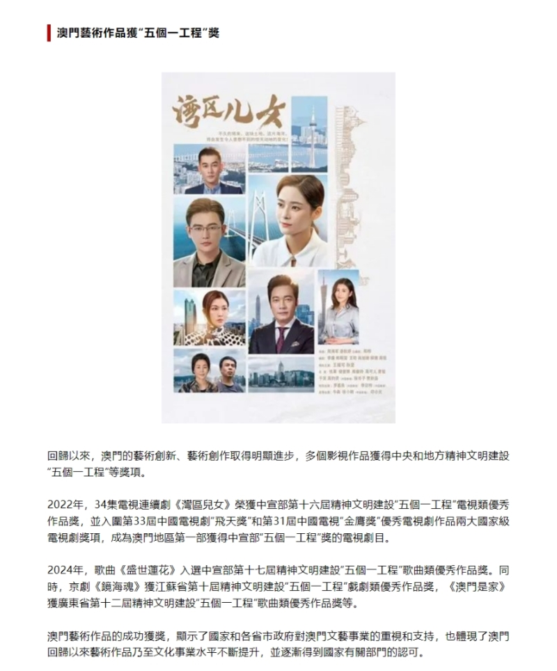 近日,南光文创联合出品的《湾区儿女》入选“25年25事:回归以来澳门文化事业发展大事”。该评选由澳门中国澳门学学会、澳门文化界联合总会学术委员会合办,澳门科技大学社会和文化研究所、人文艺术学院协办,澳门基金会资助,集中反映了回归以来澳门文化事业发展的标志性事件。